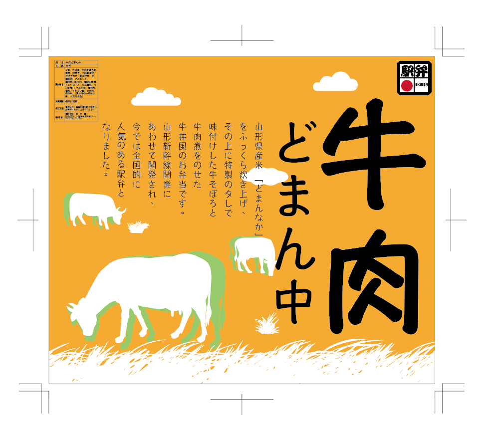 駅弁 投稿者: wpmaster オフ 背景色を牛肉の良い焼き具合であるきつね色で表現し、のどかな風景にすることで自然で育った健康な牛を表現しました。牛の背景に少し緑を出混ぜたのは健康な食事を食べさせて栄養満点であることを表しています。 投稿ナビゲーション 過去の投稿前へ スーパーのトレー次の投稿次へ 全五段